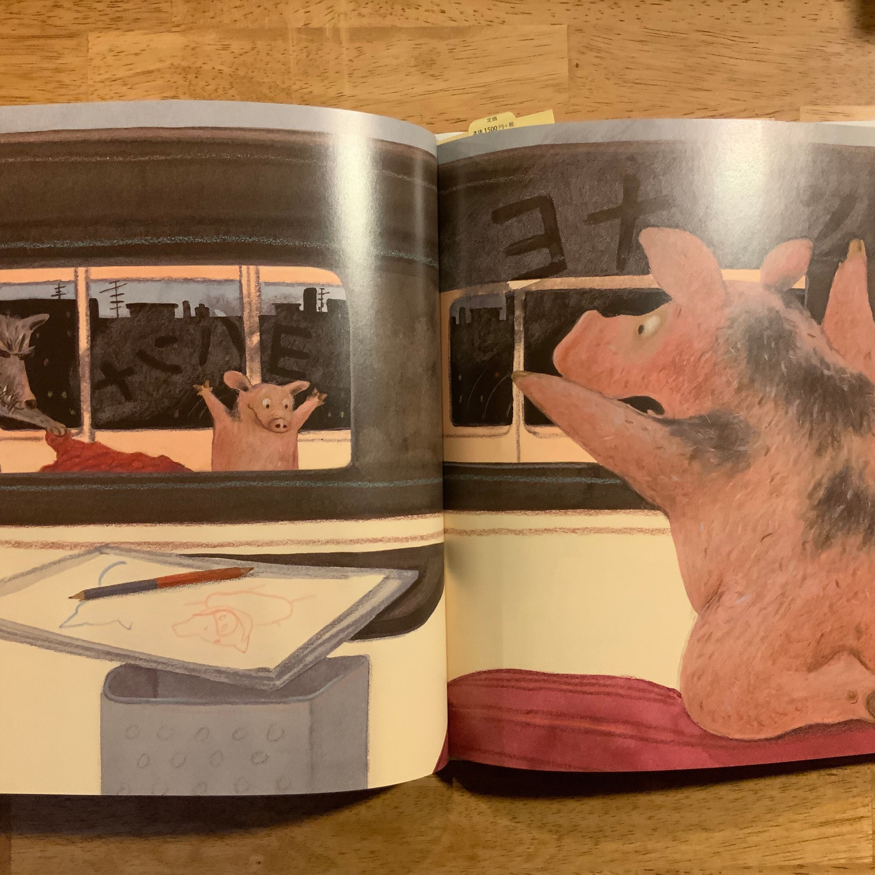 絵描きが電車の絵を描いてます。電車の中にはいろいろな動物たち。