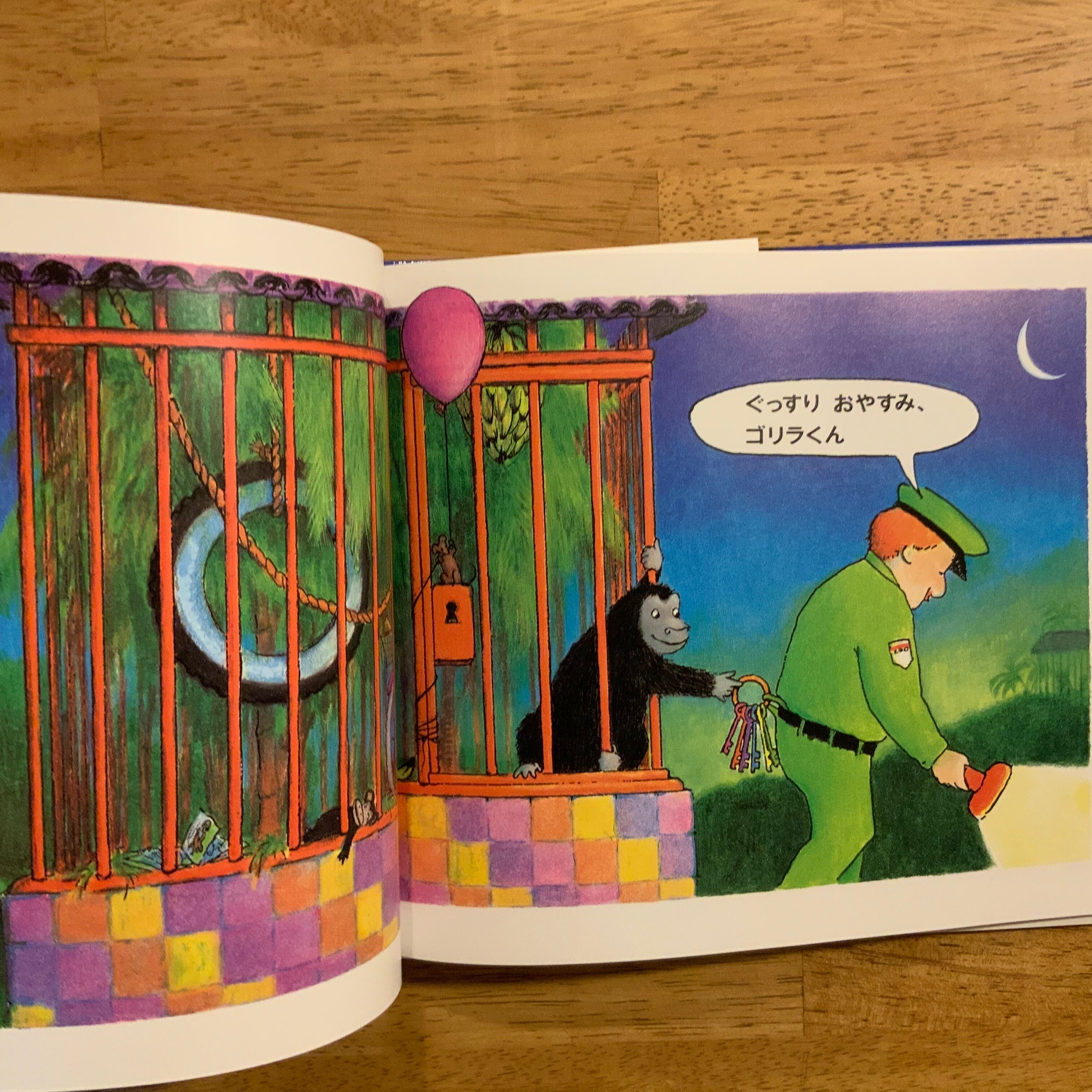 いたずらっこのゴリラくん、指を口に当て、シーっとジェスチャーしてますね。手に持ってるのは?
