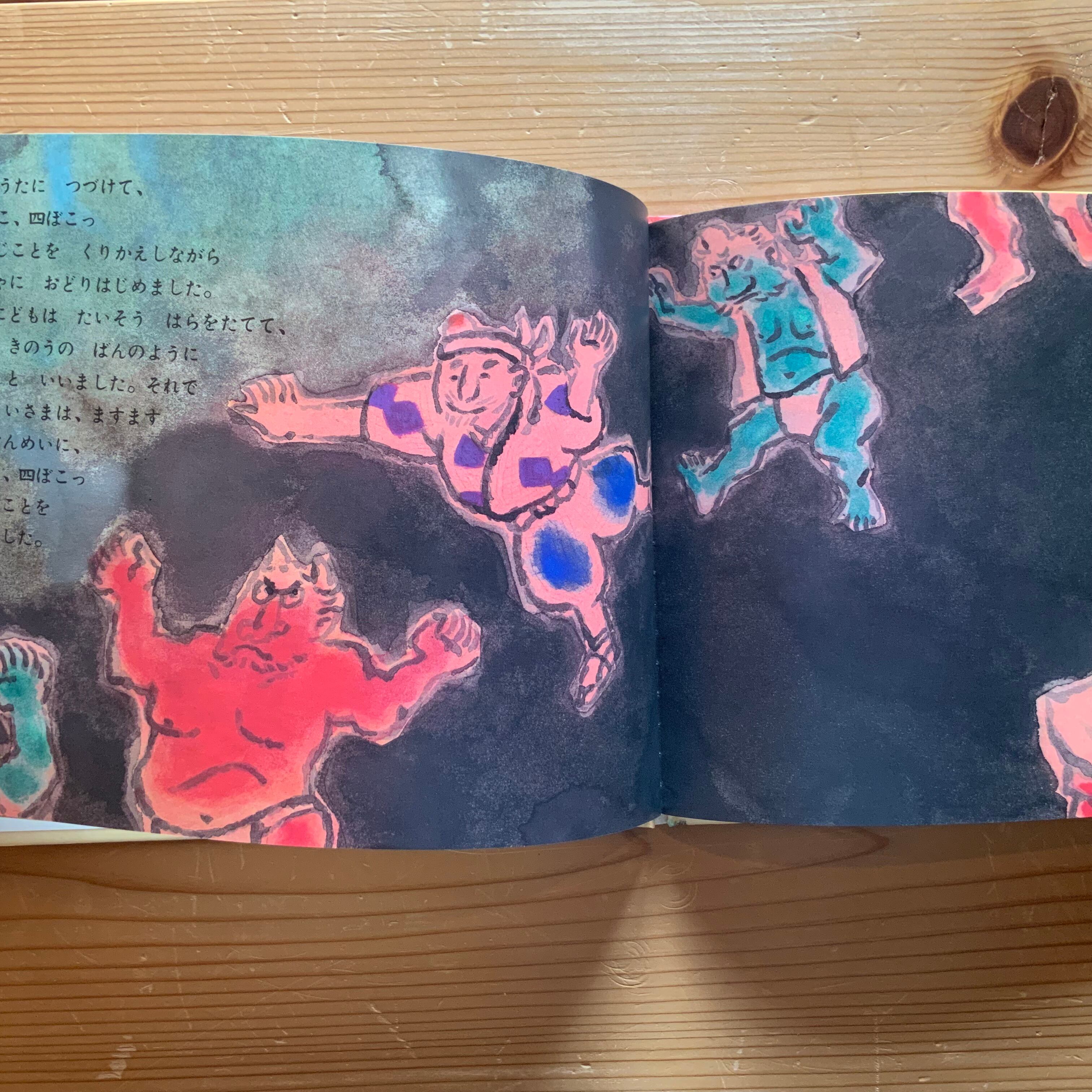 大川悦生さんの『こぶとり』(ポプラ社)では天狗になっていますが、『こぶじいさま』(福音館)同様、大勢でお堂の周りを歌い踊ります。炭焼き小屋とかではなくお堂。異界につながるキーポイントがお堂というのもいいです。お堂って神仏を祀るものですよね。歌や踊りを奉納しているのでしょうか。鬼たちが悪者だとは思えません。